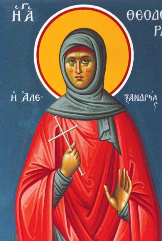 Преподобна Теодора је по наговору неке врачаре, учинила прељубу. Одмах је почела  гристи савест. Ошишала се, обукла у мушко одело и ступила у мушки манастир Октодекат, под именом Теодор. Великим трудом, постом, бдењем, понизношћу и плачним покајањем задивила је сву братију. Када је нека блудница оклеветала да ја са њом затруднела, није хтела да се правда. Изгнана из манастира, 7 година је пребивала по шумама, негујући блудничино дете. Ту је победила силна демонска искушења. Онда је игуман манастира прими назад, где се након 2 године упокоји у Господу, тек тада видеше да је била жена. Њен муж дође на сахрану и остаде у келији своје жене до смрти. Света Теодора имала је велику благодат од Бога. Упокојила се 490. године.