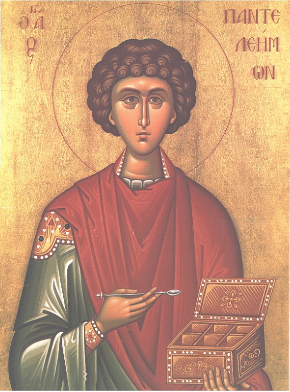 Свети великомученик Пантелејмон (грч. Παντελεήμων = пун самилости, свеосећајан) родом је из Никомидије (данашњи град Измит у Турској), од оца незнабошца и мајке хришћанке. Као младић, изучио је лекарске науке. Једнога слепца, којег су лекари узалуд лечили, он излечи именом Христовим. Лекари га оптужише цару Максимијану, пред којим се он објави хришћанином и пред ким на исти начин као и слепца излечи једног одузетог човека. Цар Светог Пантелејмона стави на муке, али Господ му се јављао неколико пута и исцељивао га је. На крају, на губилишту он клече на молитву. Џелат га удари мачем по врату, али мач се поломи. И није га могао посећи док није завршио молитву и сам рекао да га посеку.Свети Пантелејмон је пострадао 304. године. Мошти су му чудотворне. Призива се у молитвама при водоосвећењу и јелеосвећењу.