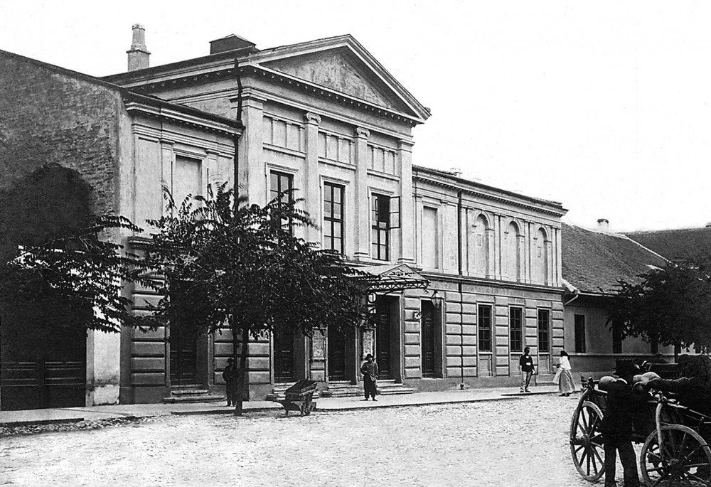 Друштво за изградњу позоришта у Сомбору основано је 1877. године, а позоришна зграда у класицистичком стилу, са обележјима еклектицизма, сазидана је до краја новембра 1882. године, када је у њој приказан и први позоришни комад. Након четири године Друштво је позоришну зграду пренело у власништво града. Како град није имао своје професионално позориште, зграда је уступана гостујућим српским, мађарским и немачким позориштима (новосадско Српско народно позориште одиграло је у Сомбору, од 1863. до 1914. године, 864 представе, односно највећи број представа након Новог Сада). Статус плаћеног градског службеника у то време имао је „бина-мајстор“, задужен за бригу о позоришној згради, инвентару и гардероби.